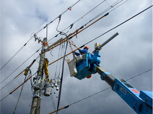 私たちは、生活に欠かすことのできない電気を供給するために、 配電線設備の新設・改修・撤去等を行っています。 また、自然災害や事故などによる停電に迅速に対応し早期復旧に努め、 人々の安全で快適な生活と社会インフラを影から支え続けています。